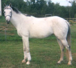 Abby is my flea-bitten grey thoroughbred mare that was bred specifically for dressage (though created in HFSHC). She is 16.2 hands and 12 years old. I have been competing her in dressage at 3rd and 4th levels. She would be farther along, if I hadn't been using her as a broodmare. She is doing very well, and is schooling, very lightly I might add, some Prix St. Georges level moves and since she was not in foal for 2002, I hope that she'll pick it up well enough to debut in PSG sometime! Abby no longer has brood years open and she has officially retired from brooding!
